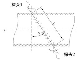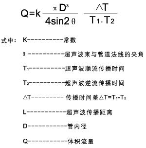 當超聲波在液體中傳播時,探頭1發射的超聲波脈沖被探頭2所接收,同時,探頭2也發射超聲脈沖,探頭1接收,則順流方向聲波傳播速度會增大,逆流方向則減小,同一傳播距離就有不同的傳播時間,利用傳播時間之差與被測流速之關系求取流速,進而得出流量,其關系式如下: |