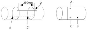 | 去掉定位紙,從點C開始,在所劃直線上量出安裝距離L,從而決定出B點。這樣A、B兩點為安裝位置;例如L=280mm |